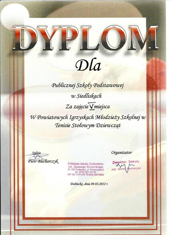 Uczennice Naszej Szkoły Magdalena Czyżowska i Klaudia Nowacka uczestniczyły w dniu 9 marca 2012 roku w Powiatowych Zawodach w Tenisie Stołowym w Dubiecku. Zajęły tam 5 miejsce.