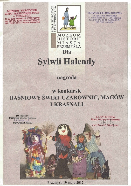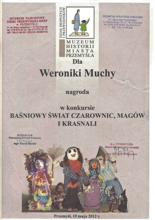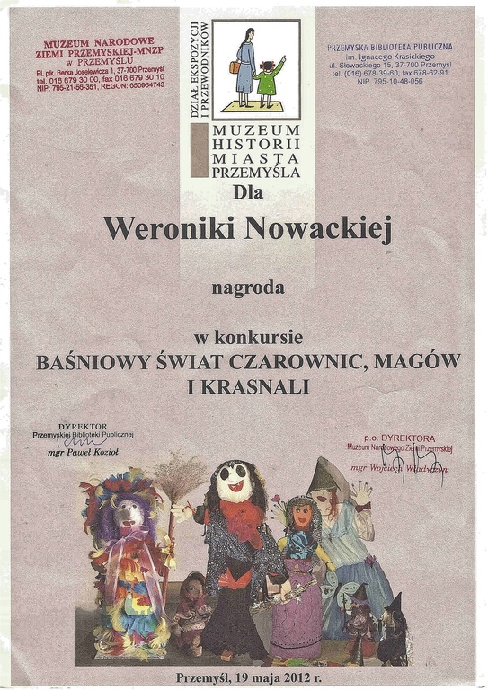 19 maja został rozstrzygnięty konkurs plastyczny „Baśniowy świat czarownic, magów i krasnali" organizowany przez Muzeum Historii Miasta Przemyśla. Pierwszą nagrodę zdobyła czarownica „Hela” wykonana przez uczennice klasy pierwszej Naszej Szkoły : Weronikę Muchę, Sylwię Halendy i Weronikę Nowacką. Do konkursu przygotowała uczennice wychowawczyni. klasy - Pani Małgorzata Stec, a koordynatorką imprezy była Pani Grażyna Obrocka. Jest to wielki sukces klasy I ponieważ nasze czarownice zostały wyróżniane pośród 40 prac. Uczennice otrzymały dyplomy, cenne nagrody i miały okazję uczestniczyć w „Nocy muzeów”.