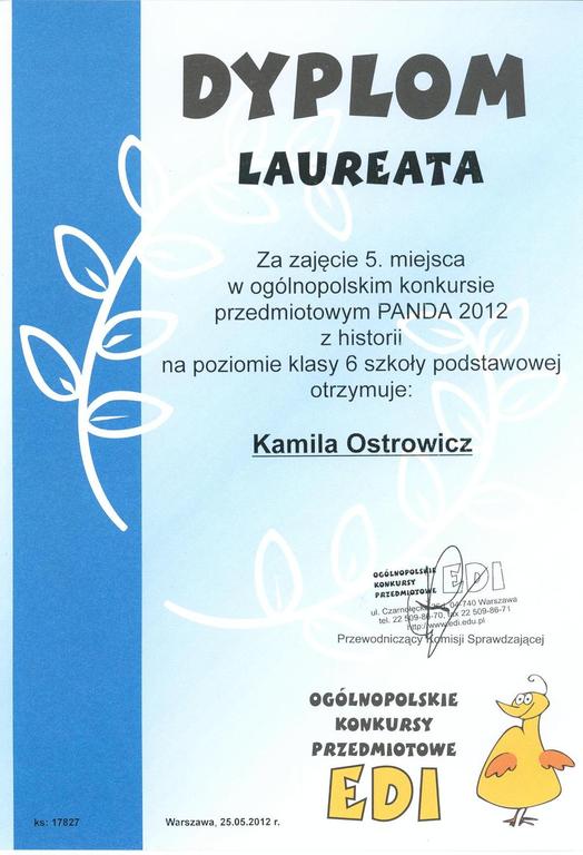 - Piąte miejsca i nagrody książkowe w konkursie historycznym dla Kamili Ostrowicz i Kingi Kasprzyk oraz wyróżnienia dla Magdaleny Czyżowskiej i Gracjana Dronia.