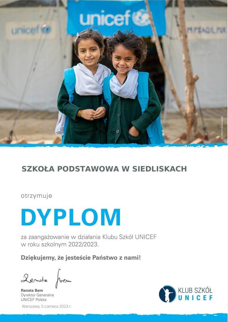 Z przyjemnością informujemy, że nasza szkoła otrzymała dyplom za zaangażowanie w działania Klubu Szkół UNICEF w roku szkolnym 2022/2023. Klub Szkół UNICEF to inicjatywa edukacyjna, która zrzesza placówki zainteresowane propagowaniem wśród swoich podopiecznych idei niesienia pomocy najbardziej potrzebującym dzieciom na świecie. Jako szkoła należąca do Klubu nie tylko uczestniczymy w akcjach edukacyjnych przygotowywanych przez UNICEF, ale przede wszystkim działamy aktywnie na polu promocji i realizacji praw dziecka. Koordynatorem akcji była pani Justyna Gawlikowska.