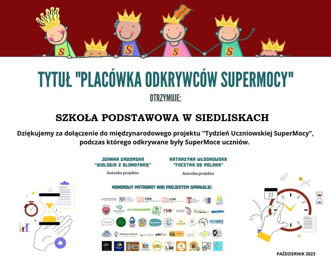 W dniach od 16 do 20 października 2024 roku nasza szkoła uczestniczyła w międzynarodowym projekcie "Tydzień Uczniowskiej SuperMocy", podczas którego odkrywane były SuperMoce uczniów. Podczas zajęć uczniowie dowiedzieli się, jak efektywnie zarządzać swoim czasem. Poznali metody służące do określania priorytetów takie jak "Metoda ABC" i "Kwadrat priorytetów", a także wzięli udział w rozpoznawaniu "Pożeraczy czasu". Koordynatorem projektu była pani Justyna Gawlikowska.