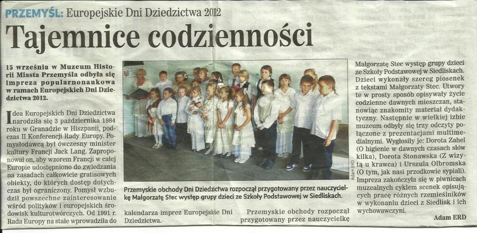 15 września w Muzeum Historii Miasta Przemyśla odbyła się impreza popularnonaukowa w ramach Europejskich Dni Dziedzictwa 2012. Przemyskie obchody Dni Dziedzictwa rozpoczął przygotowany przez Panią Małgorzatę Stec występ uczniów klas II i V naszej szkoły. Dzieci wykonały szereg piosenek z tekstami autorstwa Pani Małgorzaty Stec. Utwory te w prosty sposób opisywały życie codzienne dawnych mieszczan. Następnie w wielkiej izbie muzeum odbyły się odczyty połączone z prezentacjami multimedialnymi. Impreza zakończyła się w piwnicach muzealnych cyklem scenek opisujących pracę różnych rzemieślników w wykonaniu uczniów naszej szkoły i ich wychowawczyni.