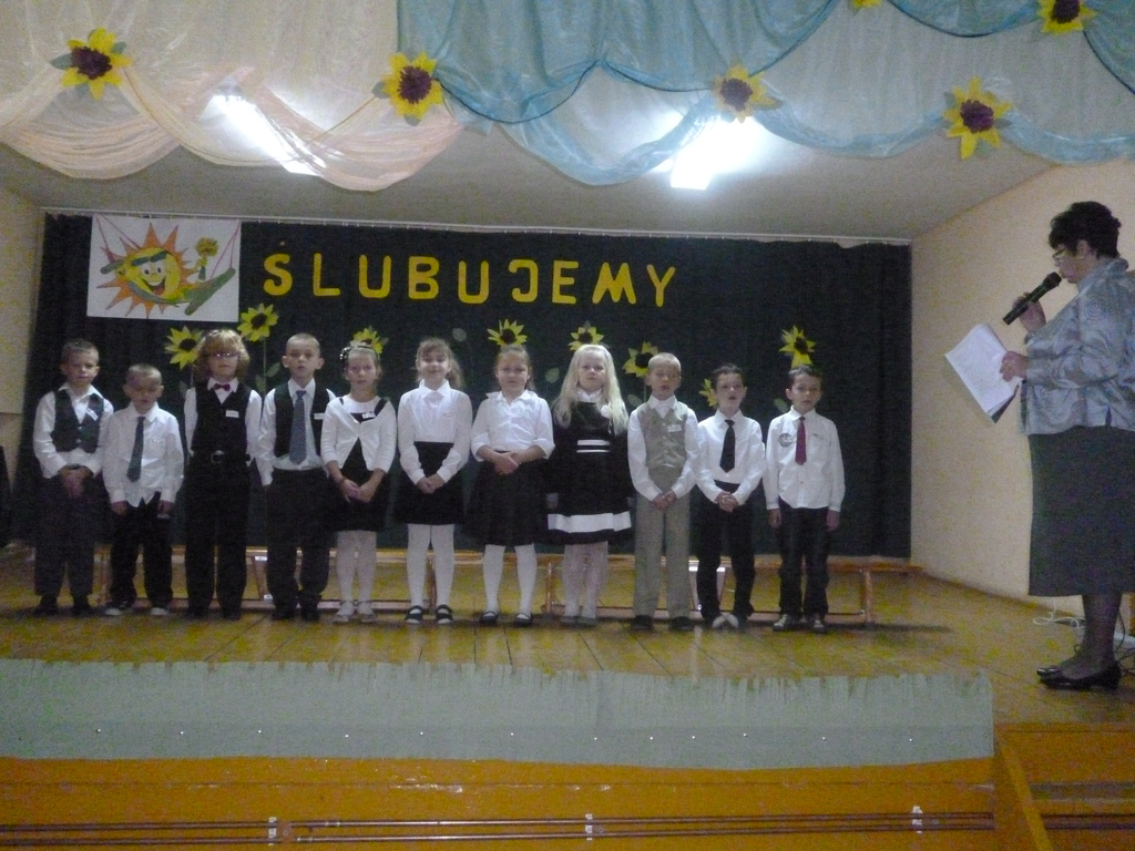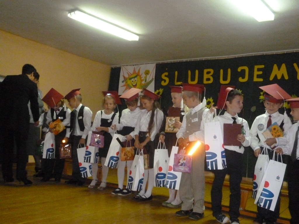 12 października 2012 r. to pamiętna data dla Pierwszoklasistów. W tym dniu w murach naszej szkoły odbyło się uroczyste Ślubowanie uczniów klasy I. Punktualnie o godzinie 9.00 Pan Dyrektor powitał nauczycieli, rodziców, uczniów i zaproszonych gości. Szczególnie gorąco powitał bohaterów uroczystości - uczniów klasy I. Pierwszoklasiści przygotowani przez Panią Marię Romańczuk-Mazur zaprezentowali program artystyczny. Recytowali wiersze, śpiewali piosenki i tym samym udowodnili, że są gotowi do złożenia uroczystego ślubowania. Aktu pasowania na ucznia dokonał Pan Dyrektor ,,wielkim ołówkiem”. Uczniowie klasy I zostali przyjęci do braci uczniowskiej. Ukoronowaniem tego było wręczenie pamiątkowych dyplomów, legitymacji szkolnych i drobnych upominków. Życzenia nowym członkom społeczności szkolnej złożyli zaproszeni goście: Wójt Gminy Medyka Pan Marek Iwasieczko, Pani Dyrektor Banku PKO BP w Przemyślu Beata Fedyk i Komendant Policji w Medyce asp. szt. Waldemar Kolczak.