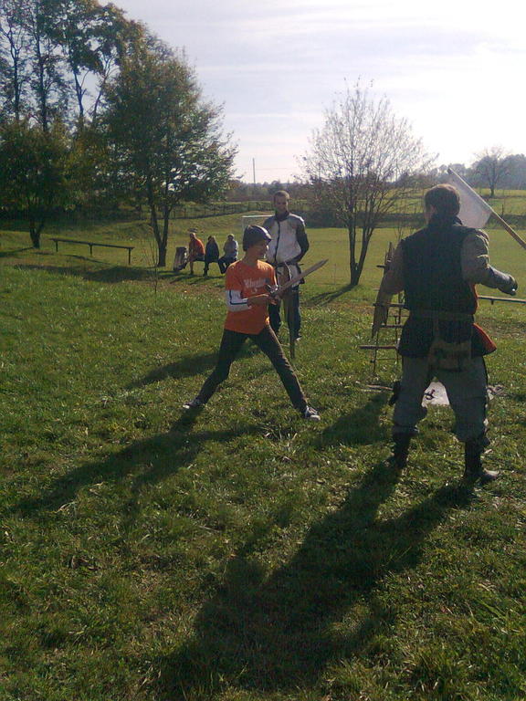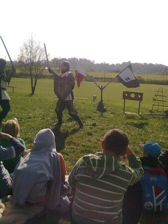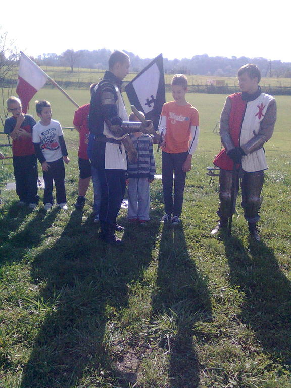 15 października gościliśmy w naszej szkole Grupę Artystyczną ,,Rekonstrukto”, która przybliżyła nam czasy Średniowiecza, kiedy to ,,rycerze zakuci w zbroje i z mieczem w ręku nie szczędzili wysiłku, by chronić honoru i ojczyzny”. Artyści zaprezentowali żywą lekcję historii przedstawiając interesujące opowieści i legendy, a także elementy rycerskiego ekwipunku i uzbrojenia. Wybrani uczniowie mieli okazją wziąć udział w walce z Krzyżakiem. Z pewnością, na długo pozostanie w pamięci zapierający dech w piersiach pojedynek rycerski, pasowanie na rycerza, a także próby siły ,,ciężkiego miecza” oraz zakuwania w dyby. Na koniec spotkania wszyscy uczestnicy mieli możliwość osobistego zapoznania się z rekwizytami. Wszystkim uczniom taka lekcja historii bardzo się podobała.